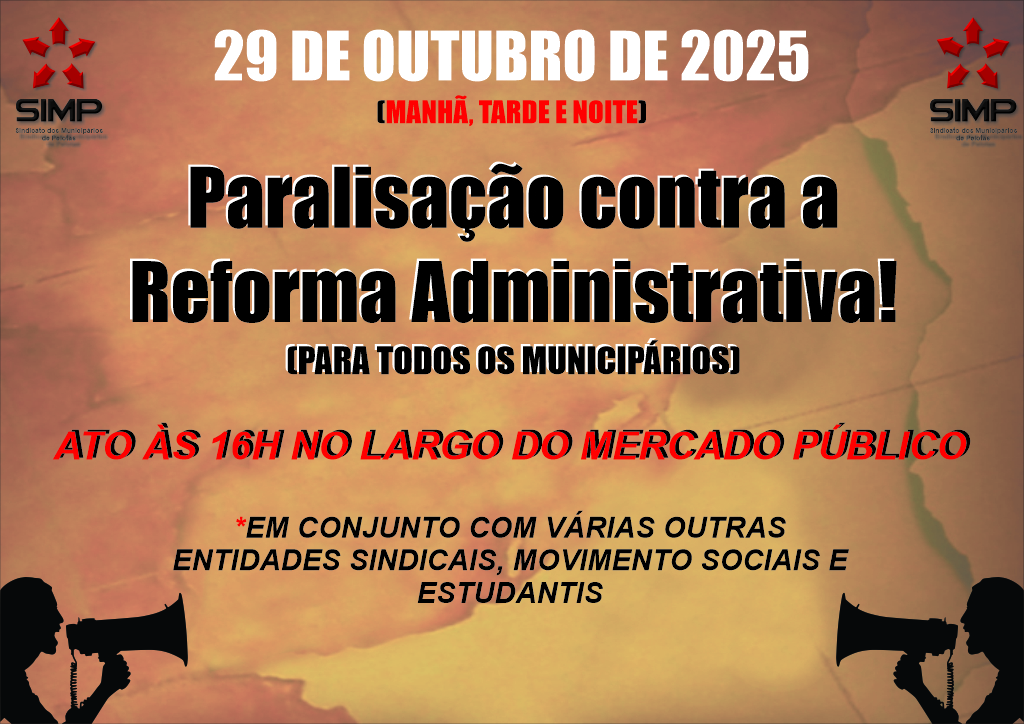 - no dia 29/10 haverá Paralisação Geral dos Municipários, SIMP em conjunto com outras entidades, havendo ato de protesto contra a Proposta de Reforma Administrativa na Câmara Federal (em breve será divulgado maiores informações);
