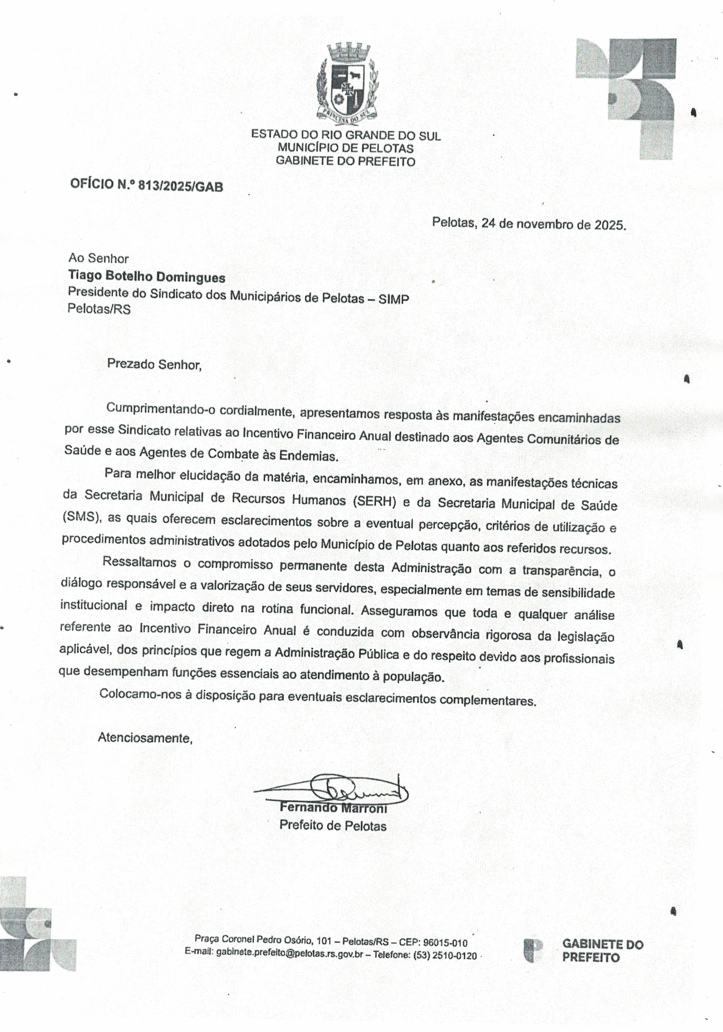 O Sindicato dos Municipários de Pelotas (SIMP) recebeu documento do Executivo Municipal referente ao pagamento/regulamentação do Incentivo Financeiro Anual (IFA) como parcela remuneratória (solicitado pelo SIMP), eis que é denominado como a décima terceira parcela complementar enviada pelo Ministério da Saúde aos Municípios que têm Agentes Comunitários de Saúde (ACSs) e Agentes de Combate às Endemias (ACEs), com o fim de poder ser utilizado como investimento em condições de trabalho ou até para pagamento de décimo terceiro salário.
