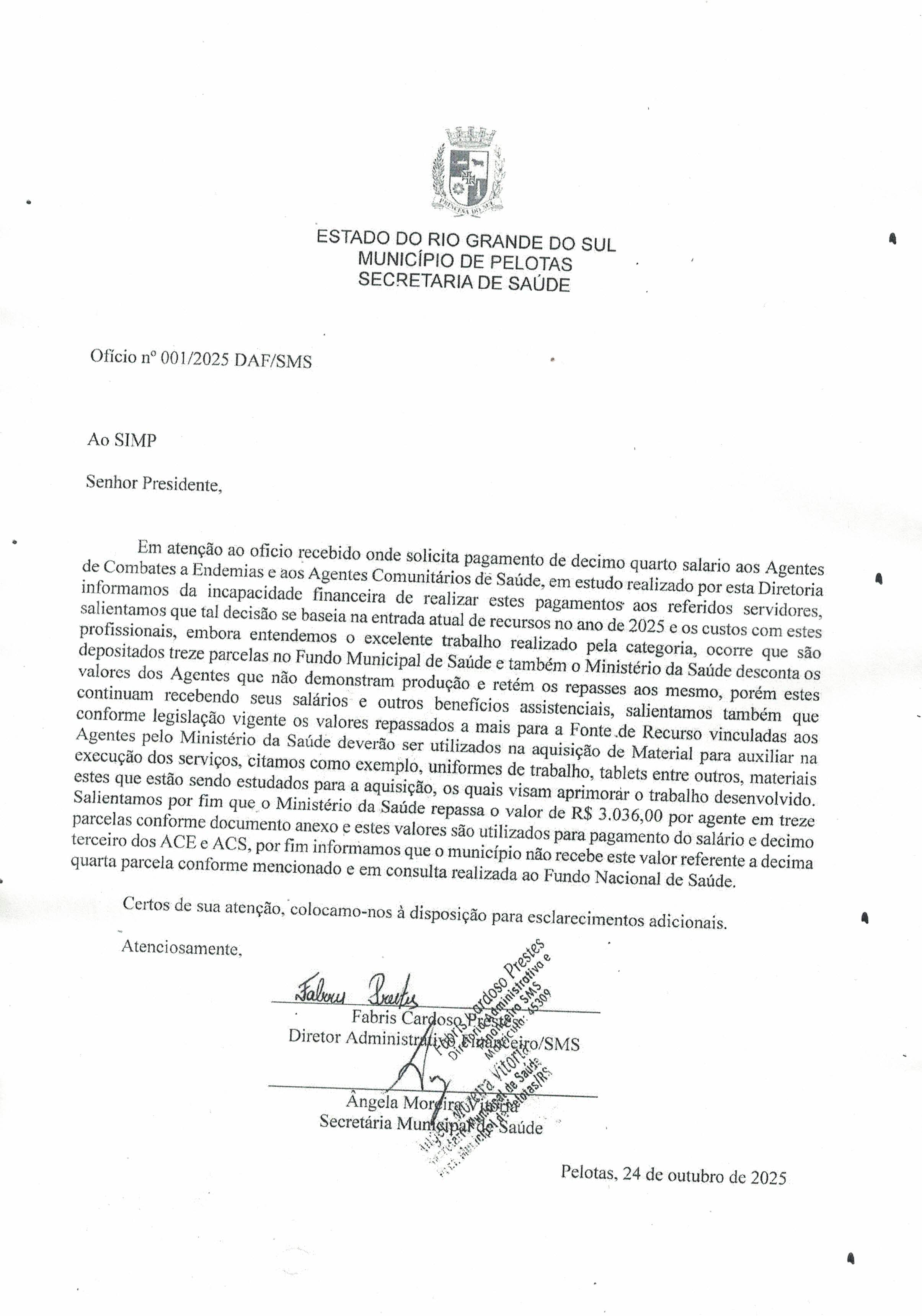 Ocorre que a resposta do Executivo só chegou ao SIMP no dia 24/11 à noite, depois dos encaminhamentos já dados por alguns ACSs/ACEs, à parte do SIMP. Na resposta, o Executivo informa da incapacidade financeira de realizar estes pagamentos diretamente aos referidos servidores, salientando que tal decisão se baseia na entrada atual de recursos no ano de 2025 e os custos com estes profissionais.